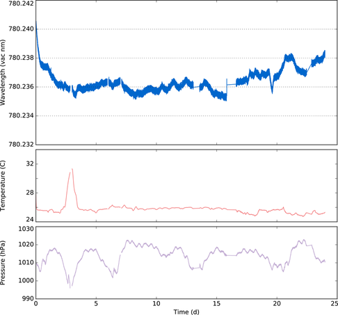 The absolute accuracy of the MWM is at best ±0.001nm (i.e. ± 1pm, about 1GHz) immediately after calibration, but a more pragmatic expectation is about ±0.005nm if moving the device from lab to lab, or through sudden temperature changes, or prolonged humidity changes. See the data below, for a wavemeter calibrated in an office then moved to a laboratory where it was used to measure the wavelength of a frequency-stabilised laser. The measured wavelength shifted quickly and then settled down to within a +/- 1pm band for three weeks, despite air conditioning failure (day 3; device temperature increased from 25 to 31 °C) and relocation in the lab on day 16.